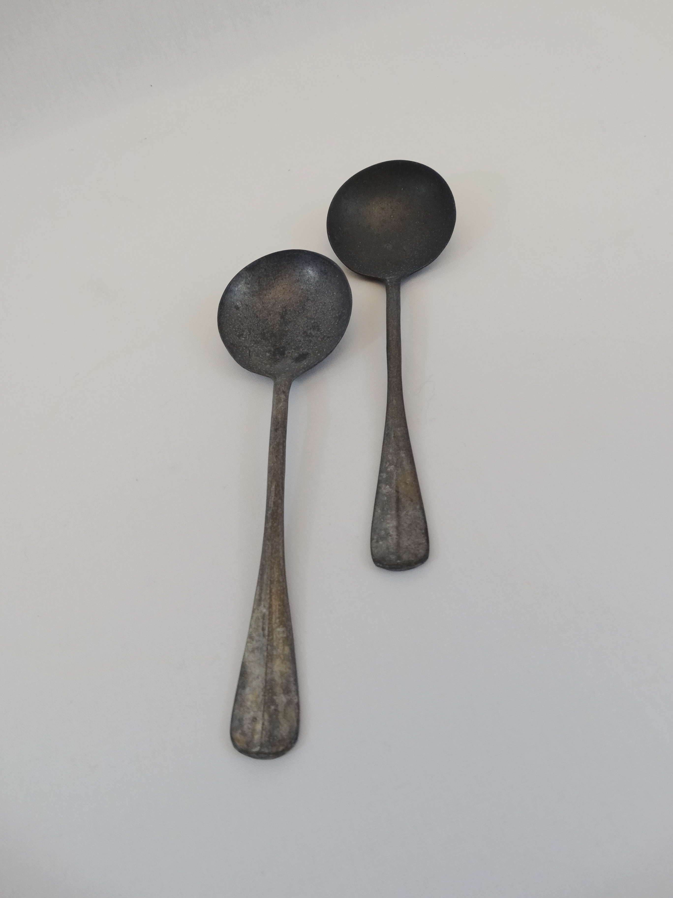 Lepels om oliebolbeslag in de olie te doen. Alluminium, grijs.
