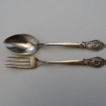 Ecru, katoen, borduursel blauw/geel met pofmouwtjes.