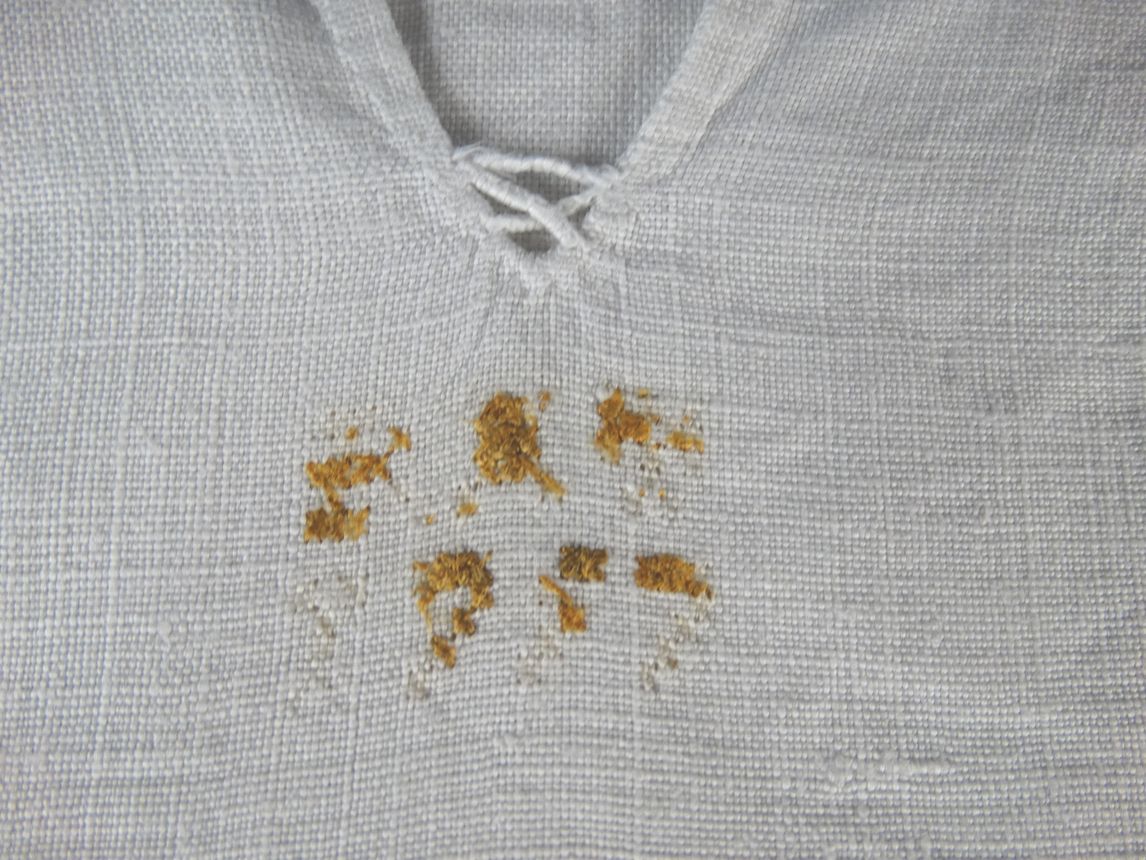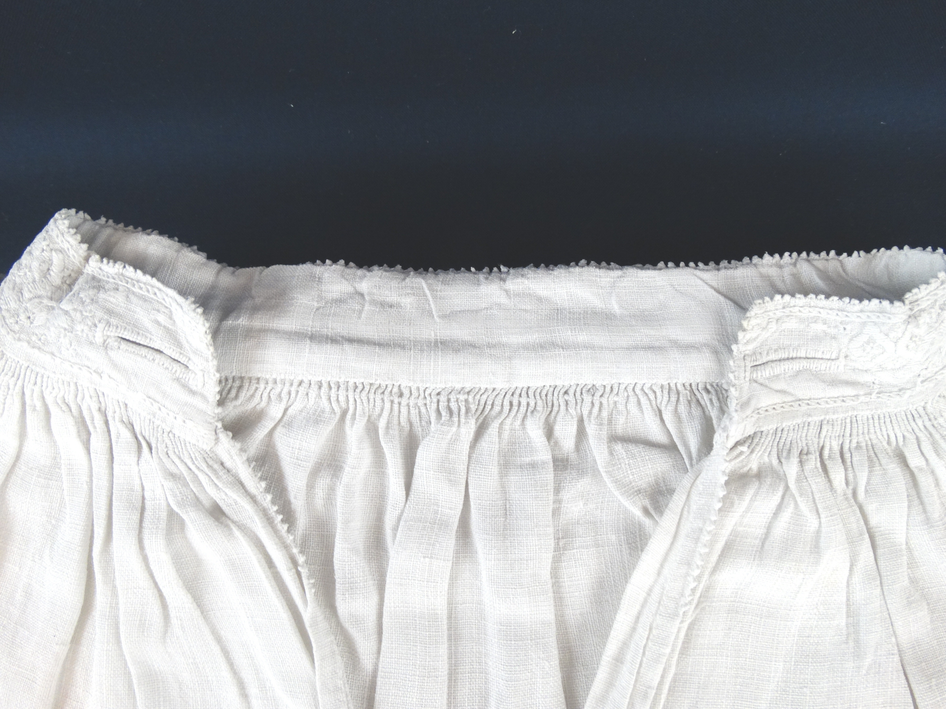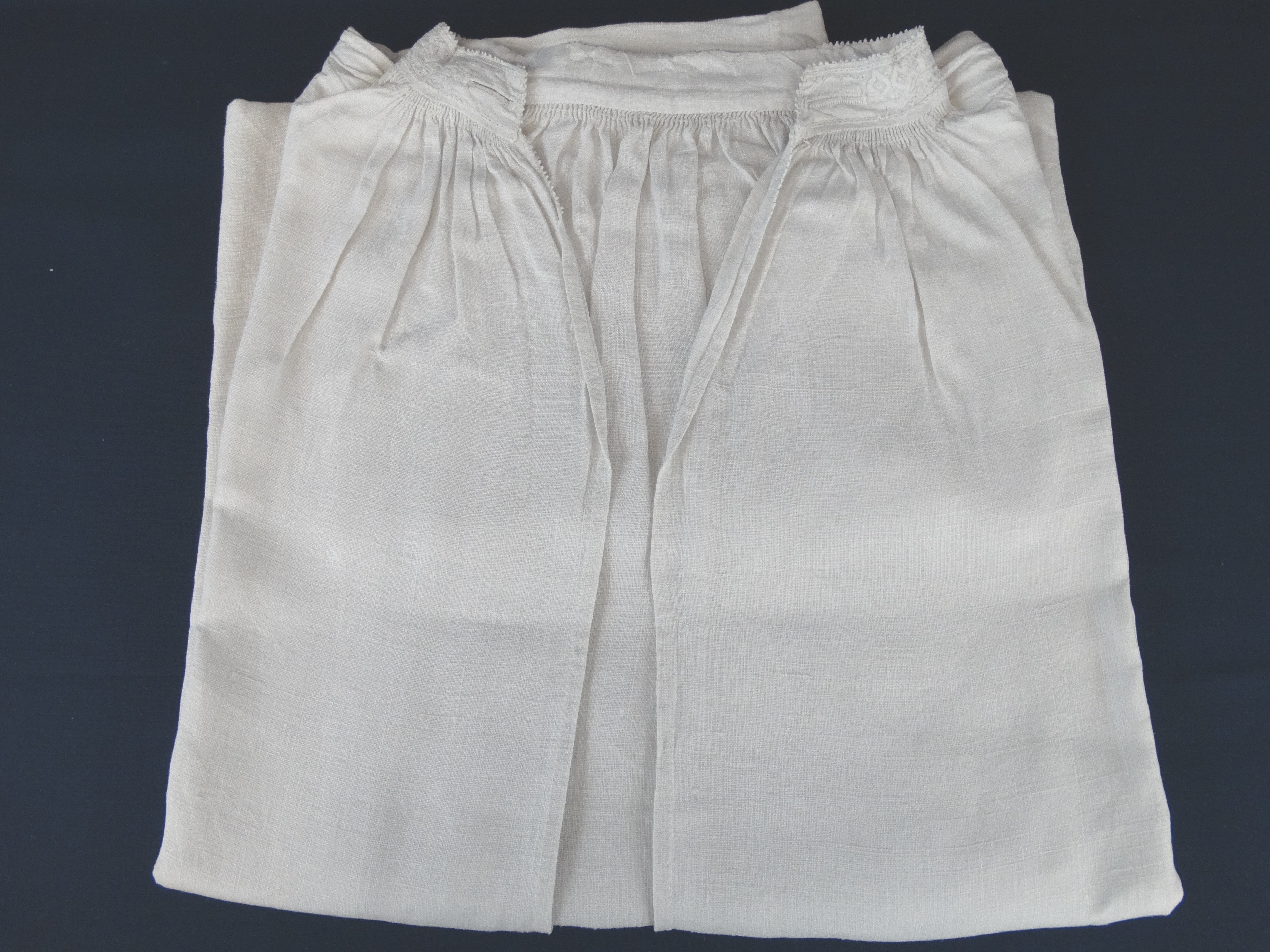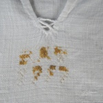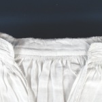 Linnen, wit, met kort bewerkt boordje, 2 knoopsgaten zonder knopenpen, split met netje. Monogram: EW 1744?