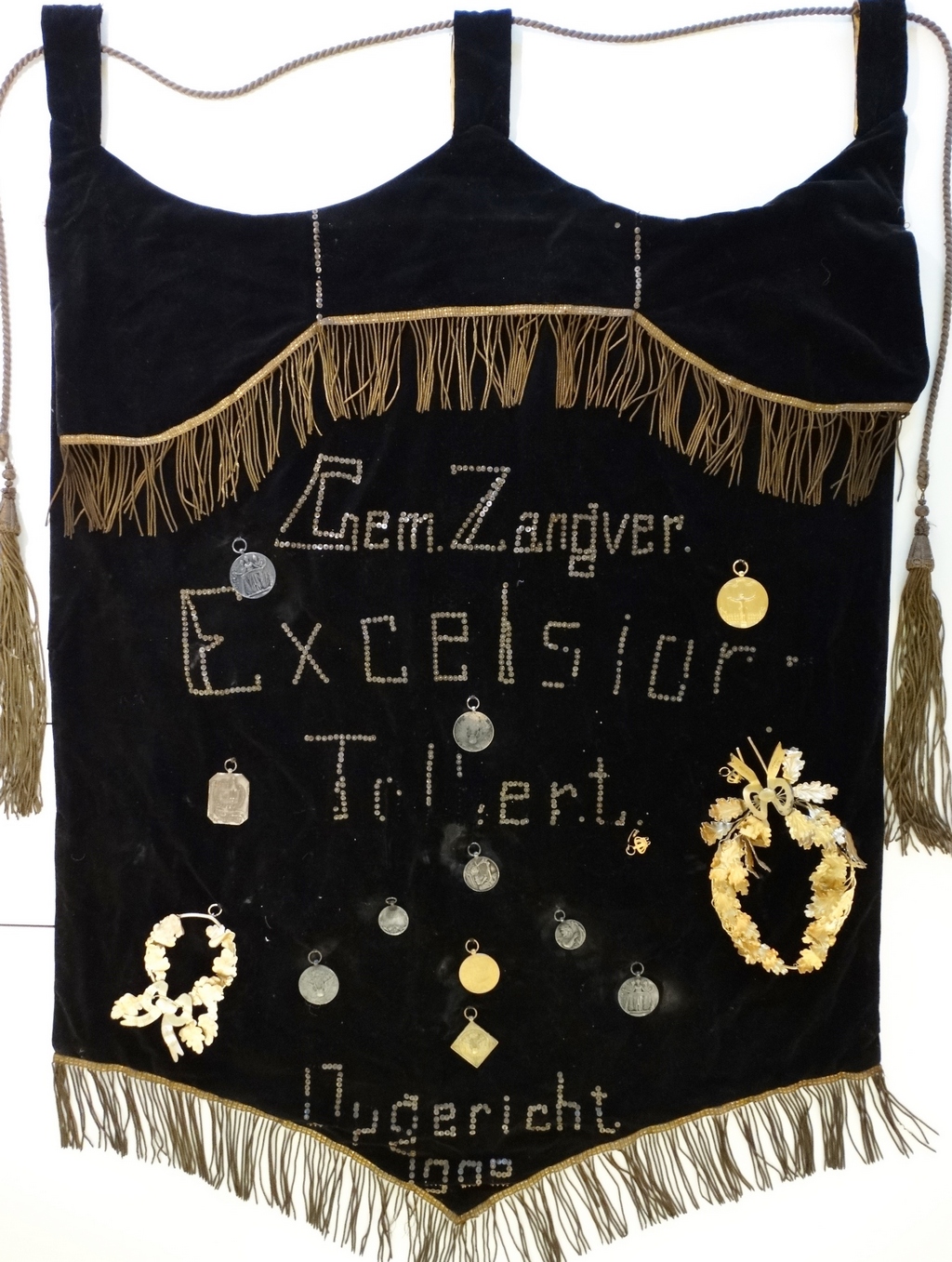 Zwart flueel, franje, kwasten, 11 medailles, 2 x lauwerkrans, opschrift in lovertjes.
