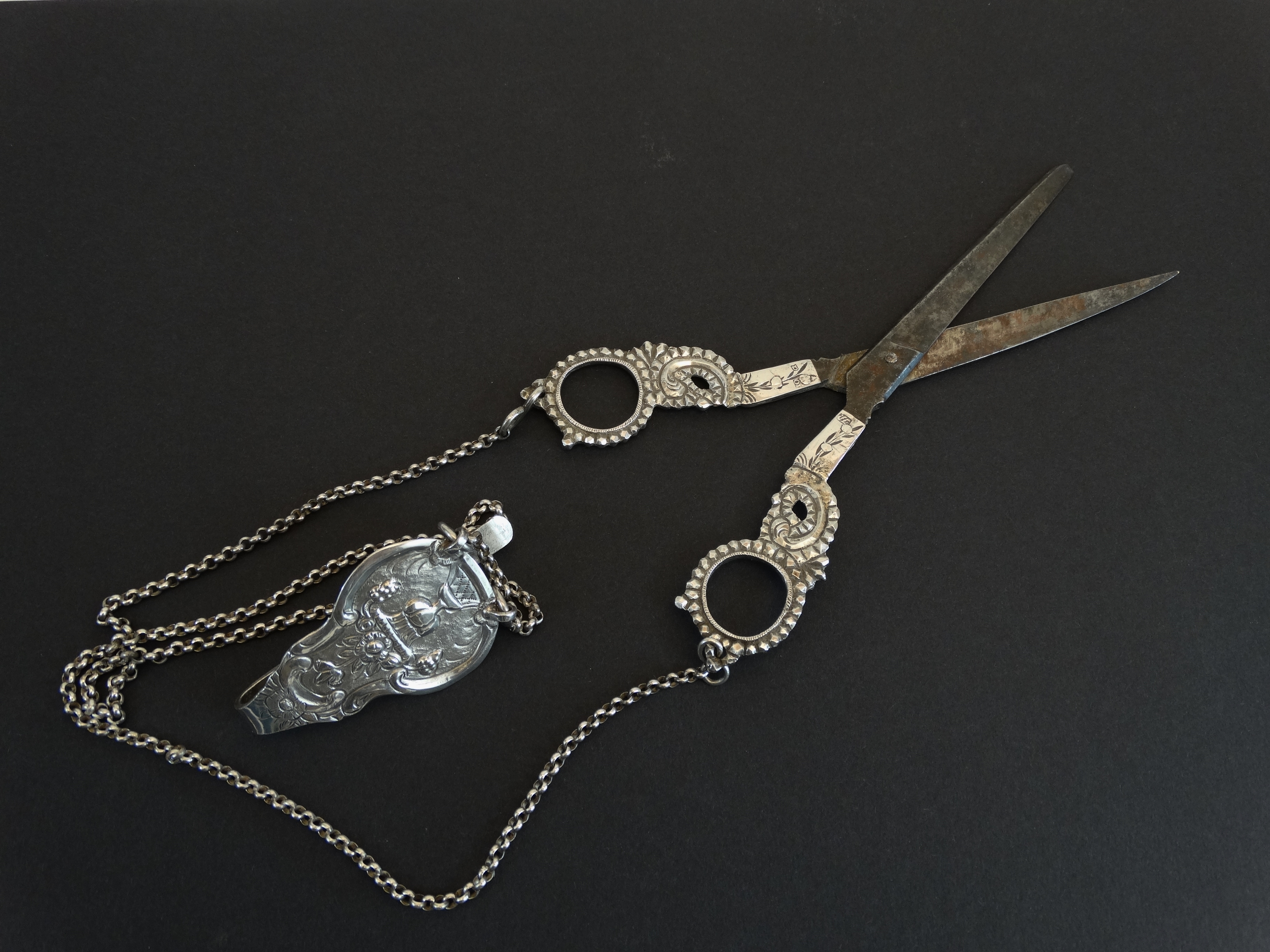 Zilver, ijzeren bladen, jasseron ketting, haak, alles bewerkt, tuigje.