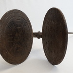 Zwarthoutenbord met snijwerk en koperkleurig bord met spreuk.